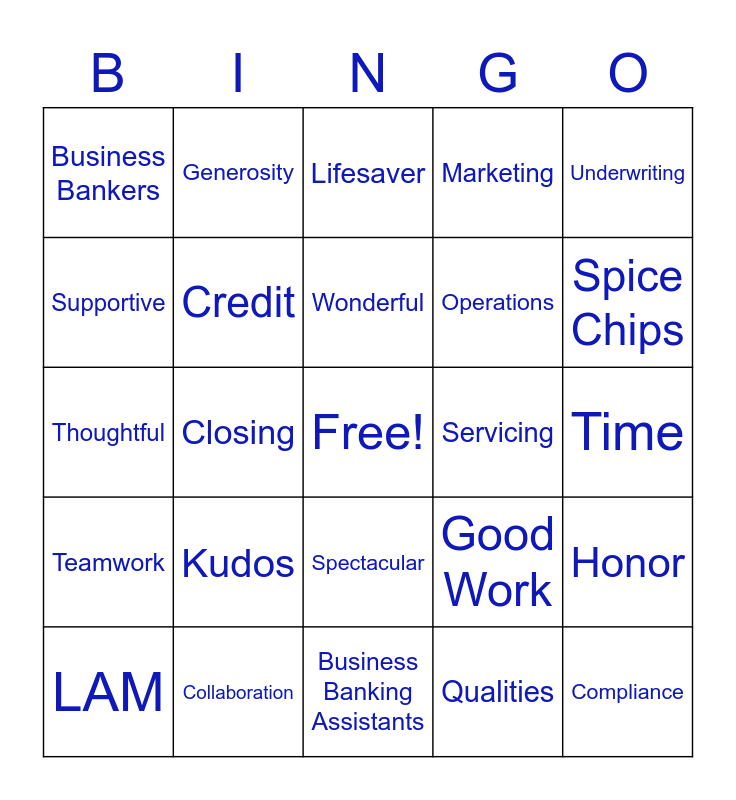 This bingo card has a free space and 56 words: LAB, LAM, E-Team, Business Bankers, Business Banking Assistants, Retail, Credit, Loan Ops, Operations, Finance, Marketing, Sales, IT, HR, MLO, Processor, Underwriting, Closing, MLO Assistant, Compliance, Servicing, Thank you, Good Work, Lifesaver, Perfect, Wonderful, Keep it up, Team, Spice Chips, Recognition, Gratitude, You rock, Feedback, Employees, Time, Supportive, Thoughtful, Dedication, Teamwork, Generosity, Spectacular, Kindness, Caring, Staff, Support, Kudos, Collaboration, Belonging, Positive, Admire, Qualities, Growth, Feelings, Believe, Honor and Award.