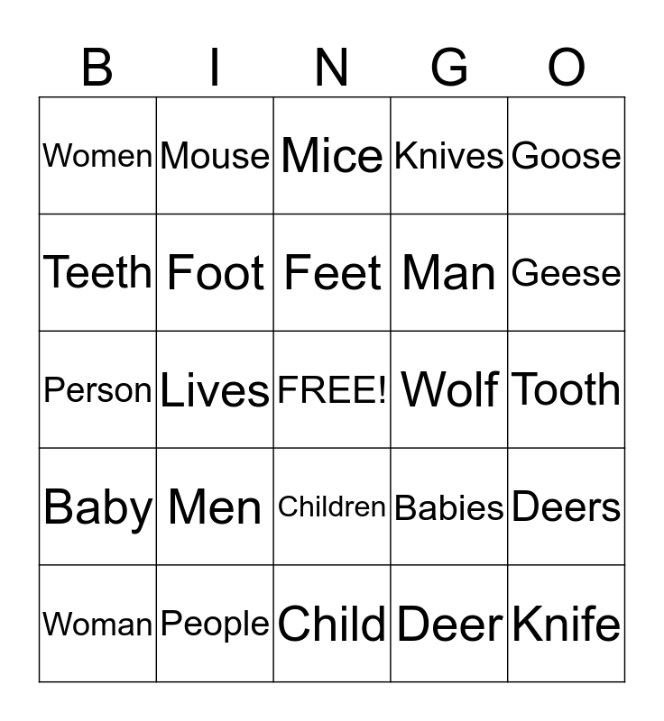 This bingo card has a free space and 24 words: Men, People, Feet, Woman, Goose, Women, Teeth, Mouse, Wolf, Children, Man, Person, Babies, Deers, Foot, Deer, Tooth, Mice, Geese, Lives, Knife, Baby, Knives and Child.