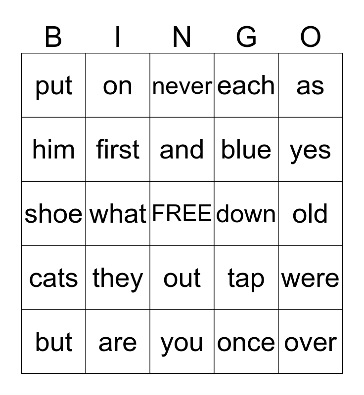 This bingo card has a free space and 24 words: they, are, and, but, as, put, him, on, down, out, blue, shoe, tap, were, first, once, old, never, yes, what, over, cats, each and you.