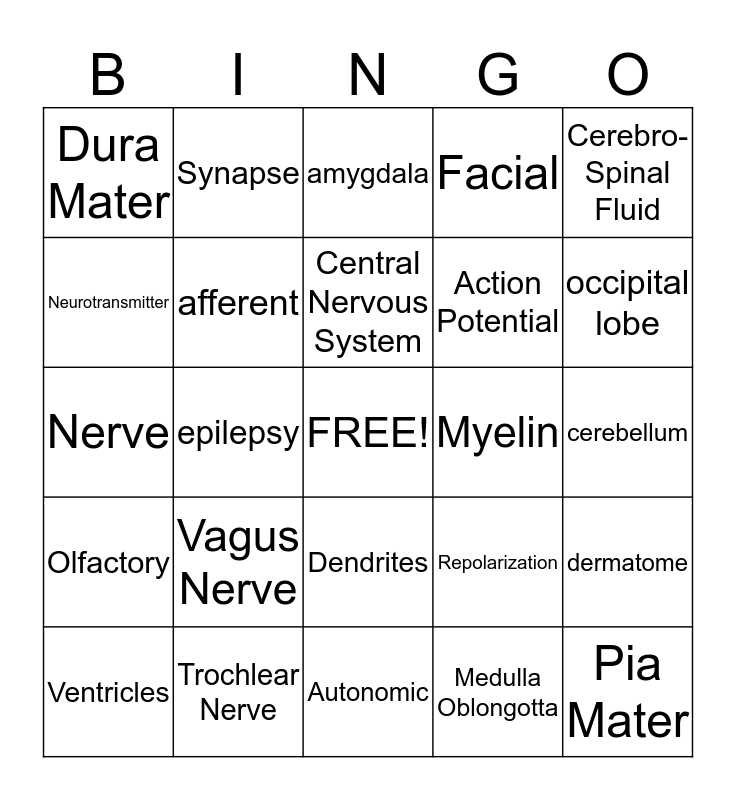 This bingo card has a free space and 24 words: Vagus Nerve, Trochlear Nerve, Central Nervous System, Ventricles, Cerebro- Spinal Fluid, Dura Mater, Neurotransmitter, Synapse, Myelin, Dendrites, Action Potential, Nerve, Repolarization, dermatome, afferent, Medulla Oblongotta, cerebellum, amygdala, occipital lobe, epilepsy, Pia Mater, Olfactory, Facial and Autonomic.