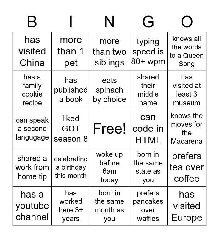 This bingo card has a free space and 24 words: celebrating a birthday this month, has worked here 3+ years, eats spinach by choice, has a youtube channel, knows all the words to a Queen Song, has visited China, has a family cookie recipe, more than 1 pet, can code in HTML, woke up before 6am today, shared their middle name, can speak a second langugage, born in the same state as you, prefers tea over coffee, has published a book, prefers pancakes over waffles, knows the moves for the Macarena, more than two siblings, has visited at least 3 museum, liked GOT season 8, has visited Europe, shared a work from home tip, typing speed is 80+ wpm and born in the same month as you.