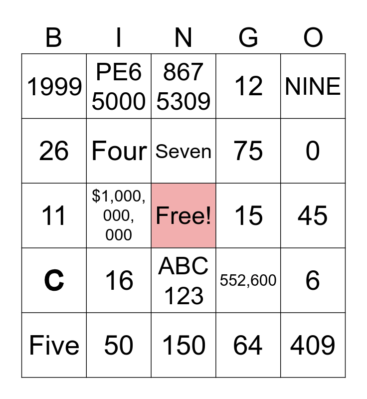 This bingo card has a free space and 39 words: ONE, TWO, 3, Four, Five, ABC 123, Seven, Eight, NINE, C, $1,000, 000, 000, 12, 409, 45, 15, 16, 1984, 1999, 19, 552,600, 26, 150, 75, 0, 17, 100, 76, 110, 96, PE6 5000, 69, 63, 867 5309, 50, 64, 99, 6, 11 and FREE.