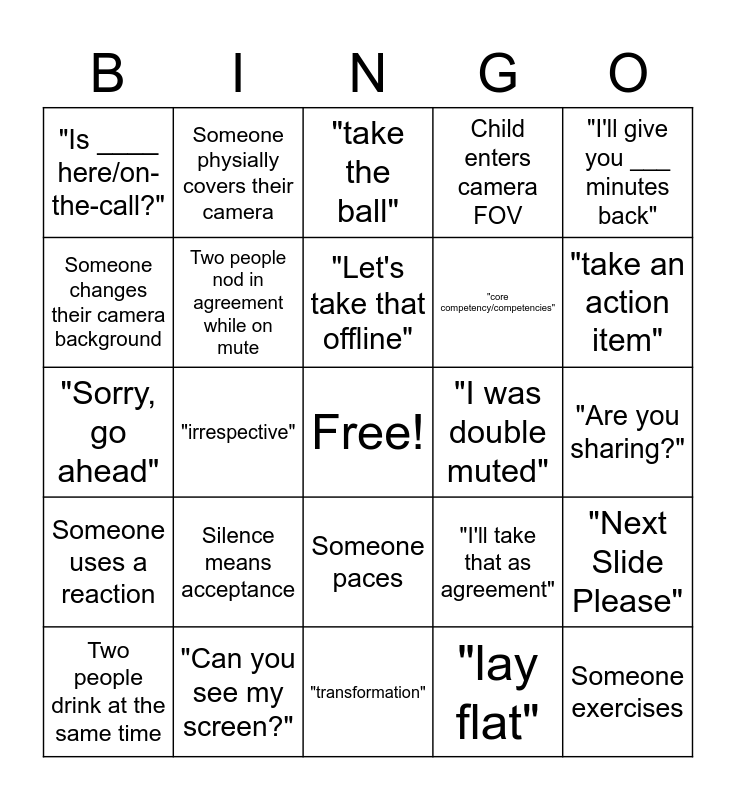 This bingo card has a free space and 100 words: "agenda", "Anyone?", "Are you sharing?", "around the room", "best practice", "Big Rocks", "bottom line", "Can everybody go on mute?", "Can someone ping ____?", "Can you email that to everyone?", "Can you go back to slide/x slides?", "Can you hear me?", "can you repeat that?", "Can you see my screen?", "circle back", "circle the wagons", "core competency/competencies", "deck", "disruptive", "ECD", "heads up", "Hi this is ___, <question/comment>", "high-level", "I have a hard stop", "I have to jump to another", "I was double muted", "I'll give you ___ minutes back", "I'll take that as agreement", "I'm/Is anyone getting an echo", "in the weeds", "irrespective", "Is ____ here/on-the-call?", "just a quick question", "keep me honest", "lay flat", "Let's take that offline", "Next Slide Please", "nuts and bolts", "outside-the-box", "robust", "run that down", "sidebar conversation", "Sorry, go ahead", "statement-of-work", "take an action item", "take the ball", "tasked", "teed up", "thirty thousand feet/foot-view", "transformation", "utilize", "wait a few minutes for others join", "we can't hear you", "wheelhouse", "working meeting", Awkward Silence, Call-in goes to answering service, Car sounds, Chat question goes unanswered for 2 minutes, Child enters camera FOV, Child is heard, Comment about commute, Comment about weather, Cough, Email/IM notification heard, Garbled speech/tech issues, Meeting runs into overtime, Music is heard in the background, Pet enters camera FOV, Pet is heard, Security notification while sharing, Silence means acceptance, Silent gestures on camera while muted, Sneeze, Someone actually looks at their camera while talking, Someone adjusts appearance (hair, clothing, etc), Someone adjusts their camera, Someone changes their camera background, Someone dances, Someone does a "barrel roll", Someone eats, Someone exercises, Someone leaves to get a beverage, Someone paces, Someone partially disappears into their background, Someone physially covers their camera, Someone picks up their phone, Someone rolls their eyes, Someone stretches, Someone uses a reaction, Someone visibly talks while on mute, Three or more acronyms in a sentence, Two people are clearly background messaging each other, Two people drink at the same time, Two people nod in agreement while on mute, Two someones talk at the same time, Typing sounds, Uncontrollable muted laughter, Yawn and Email/IM popup while sharing.
