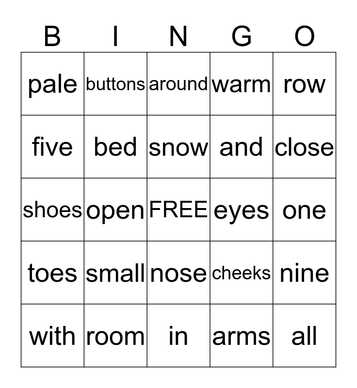 This bingo card has a free space and 24 words: small, room, snow, with, row, pale, five, buttons, eyes, nose, and, shoes, cheeks, nine, bed, arms, one, around, close, open, all, toes, warm and in.