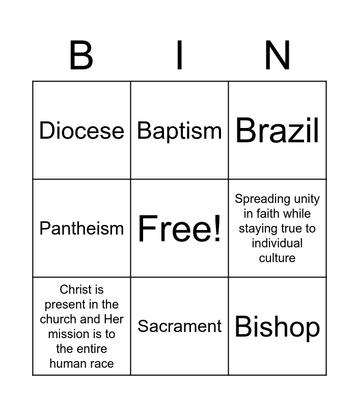 This bingo card has a free space and 9 words: Christ is present in the church and Her mission is to the entire human race, Brazil, Baptism, Pantheism, Diocese, Spreading unity in faith while staying true to individual culture, Bishop, Universal Church and Sacrament.