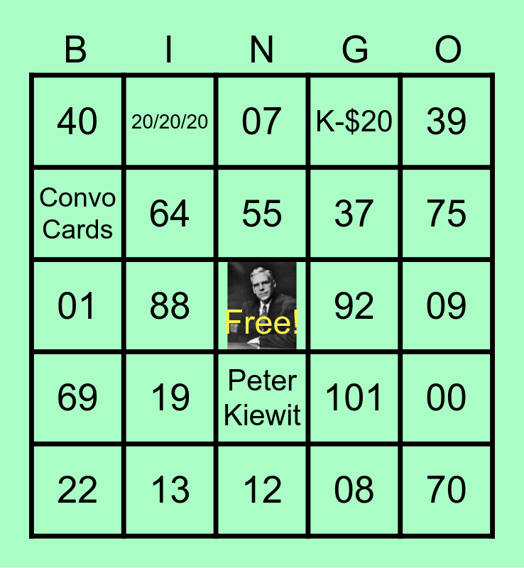 This bingo card has a free space and 29 words: 007, 13, 07, 24, 39, 40, 64, 55, 92, 00, 22, 88, 08, 70, 01, 11, 12, 101, 75, 69, 19, 77, 37, 09, Convo Cards, 20/20/20, Peter Kiewit, K-$20 and Safe Choices.