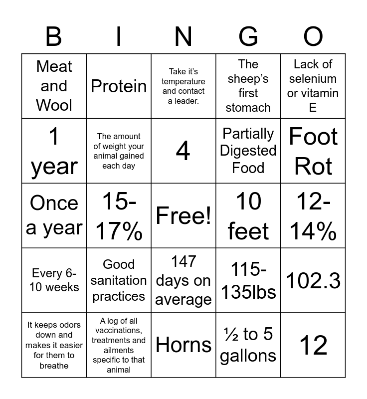 This bingo card has a free space and 28 words: 102.3, Anything harvested and used from an animal aside from muscle meat, Partially Digested Food, ½ to 5 gallons, 1 year, Take it’s temperature and contact a leader., Protein, Every 6-10 weeks, 10 feet, It keeps odors down and makes it easier for them to breathe, Once a year, The sheep’s first stomach, A log of all vaccinations, treatments and ailments specific to that animal, Horns, Foot Rot, Just above each hoof., Good sanitation practices, The amount of weight your animal gained each day, 4, 147 days on average, Meat and Wool, Directly behind the ribs, running down the spine towards the hindquarters., 12, 15-17%, 12-14%, 115-135lbs, Lack of selenium or vitamin E and 914.