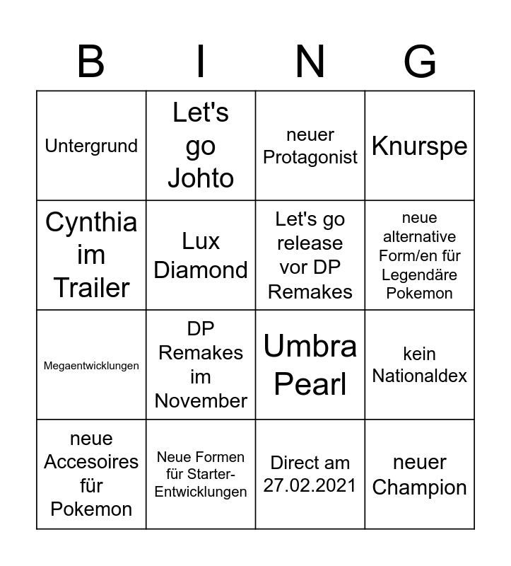 This bingo card has 16 words: neue Accesoires für Pokemon, Neue Formen für Starter-Entwicklungen, neuer Protagonist, Knurspe, Cynthia im Trailer, Let's go Johto, Umbra Pearl, kein Nationaldex, Untergrund, Lux Diamond, Direct am 27.02.2021, neue alternative Form/en für Legendäre Pokemon, Megaentwicklungen, DP Remakes im November, Let's go release vor DP Remakes and neuer Champion.