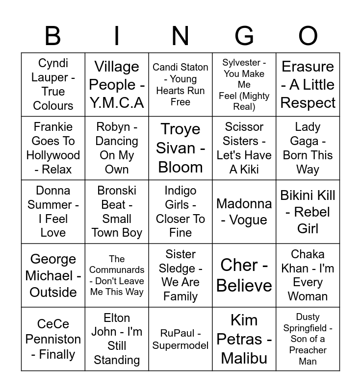 This bingo card has a free space and 39 words: Diana Ross - I'm Coming Out, Gossip - Heavy Cross, Pet Shop Boys - Go West, Robyn - Dancing On My Own, CeCe Penniston - Finally, Sister Sledge - We Are Family, Troye Sivan - Bloom, Cheryl Lynn - Got To Be Real, Erasure - A Little Respect, George Michael - Outside, Bronski Beat - Small Town Boy, Sylvester - You Make Me Feel (Mighty Real), Dusty Springfield - Son of a Preacher Man, Bikini Kill - Rebel Girl, Madonna - Vogue, The Communards - Don't Leave Me This Way, k.d. lang - Constant Craving, Cyndi Lauper - True Colours, Gloria Gaynor - I Will Survive, Cher - Believe, Frankie Goes To Hollywood - Relax, RuPaul - Supermodel, Scissor Sisters - Let's Have A Kiki, Lady Gaga - Born This Way, Queen - I Want To Break Free, Hayley Kiyoko - Girls Like Girls, Years & Years - King, Tegan & Sara - Closer, Janelle Monae - Make Me Feel, Village People - Y.M.C.A, The Weather Girls - It's Raining Men, Kylie Minogue - Can't Get You out of My Head, Candi Staton - Young Hearts Run Free, Elton John - I'm Still Standing, Kim Petras - Malibu, Planningtorock - Let's Talk About Gender Baby, Chaka Khan - I'm Every Woman, Donna Summer - I Feel Love and Disclosure feat. Sam Smith - Latch.