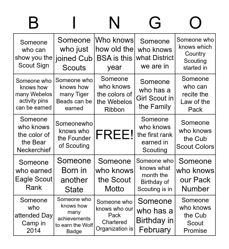This bingo card has a free space and 24 words: Someone Born in another State, Someone who knows how many achievements to earn the Wolf Badge, Someone who knows the colors of the Webelos Ribbon, Someone who attended Day Camp in 2014, Someone who knows which Country Scouting started in, Someone who can show you the Scout Sign, Someone who knows how many Webelos activity pins can be earned, Someone who just joined Cub Scouts, Someone who knows the first rank earned in Scouting, Someone who knows the Scout Motto, Someone who has a Girl Scout in the Family, Someone who knows the color of the Bear Neckerchief, Someone who knows what month the Birthday of Scouting is in, Someone who knows our Pack Number, Someone who knows how many Tiger Beads can be earned, Someone who has a Birthday in February, Someone who knows the Cub Scout Colors, Who knows how old the BSA is this year, Someone who can recite the Law of the Pack, Someonewho knows who the Founder of Scouting, Someone who knows the Cub Scout Promise, Someone who earned Eagle Scout Rank, Someone who knows what District we are in and Someone who knows who our Pack Chartered Organization is.