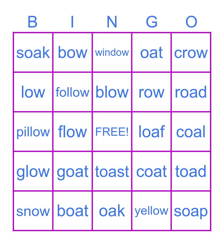 This bingo card has a free space and 24 words: goat, boat, blow, snow, crow, soak, low, bow, loaf, toast, row, pillow, coat, toad, follow, yellow, coal, window, road, flow, soap, glow, oat and oak.