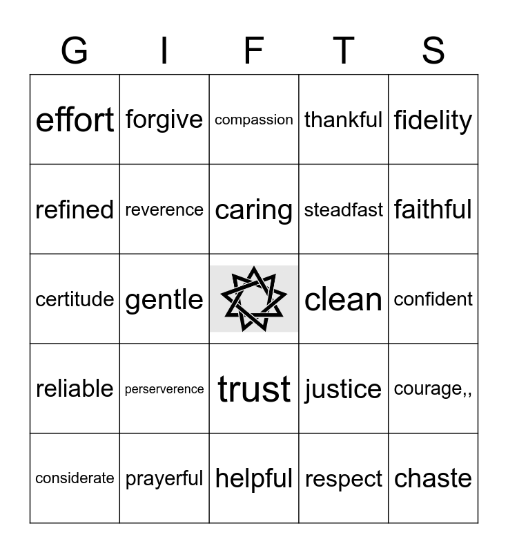 This bingo card has a free space and 59 words: peaceful, prayerful, purpose, reliable, respect, responsible, reverence, service, steadfast, tact, thankful, tolerant, refined, resolute, devotion, effort, chaste, fidelity, punctual, caring, clean, compassion, considerate, courage,,, creative, detached, enthusiasm, excellence, faithful, grateful, truth, united, attentive, flexible, forgive, friendly, generous, gentle, vision, certitude, discipline, perserverence, confident, mercy, modesty, obedient, orderly, patient, trust, helpful, honest, honor, hopeful, humble, joyful, justice, kindness, love and loyalty.