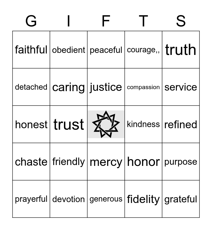 This bingo card has a free space and 59 words: resolute, devotion, effort, chaste, fidelity, punctual, caring, clean, compassion, considerate, courage,,, creative, detached, enthusiasm, excellence, faithful, grateful, truth, united, justice, kindness, peaceful, prayerful, purpose, reliable, respect, responsible, reverence, service, steadfast, tact, thankful, tolerant, modesty, obedient, orderly, patient, trust, helpful, honest, forgive, friendly, refined, love, loyalty, attentive, flexible, confident, mercy, generous, gentle, vision, certitude, discipline, perserverence, honor, hopeful, humble and joyful.
