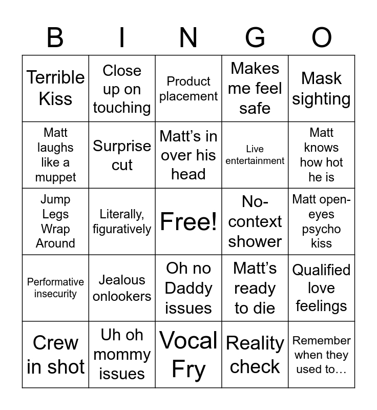 This bingo card has a free space and 34 words: What are your intentions, Reality check, Weird Hometown set, Wants kids, Performative insecurity, Surprise cut, Mask sighting, Crew in shot, Close up on touching, Matt gets too Jesus-y, Matt’s in over his head, Product placement, Medical emergency, Misleading “coming up on”, No-context shower, Matt knows how hot he is, Uh oh mommy issues, Jump Legs Wrap Around, Jealous onlookers, Matt’s ready to die, Oh no Daddy issues, Antiquated ideology, Terrible Kiss, Matt open-eyes psycho kiss, Vocal Fry, Remember when they used to…, Makes me feel safe, Matt tries to reciprocate, Live entertainment, Matt laughs like a muppet, Ehm hates when Matt says “woman”, Literally, figuratively, Qualified love feelings and Unqualified love feelings.
