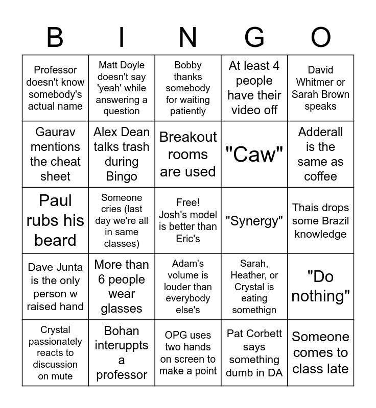 This bingo card has a free space and 41 words: Can't hear online, Paul rubs his beard, DC verbally claims that debt isn't real, Alex Dean talks trash during Bingo, Bohan interuppts a professor, Adam's volume is louder than everybody else's, Breakout rooms are used, A child appears on zoom, David Whitmer or Sarah Brown speaks, Dave Junta is the only person w raised hand, Someone cries (last day we're all in same classes), At least 4 people have their video off, Someone comes to class late, Thais drops some Brazil knowledge, "Synergy", More than 6 people wear glasses, "ZOPA", Professor doesn't know somebody's actual name, Stephen Severino asks a question he already knows the answer to, Bobby thanks somebody for waiting patiently, "Do nothing", Professor calls on 4 ppl alphabetically, OPG uses two hands on screen to make a point, "Caw", Eric, Crystal, Bohan drop airline knowledge, Jen lays down the Bingo law, Pat Corbett says something dumb in DA, Fantastic-Max, Adderall is the same as coffee, Emmett blends into the background, Somebody says 10+ word sentence without any verbs, Matt Doyle doesn't say 'yeah' while answering a question, Crystal passionately reacts to discussion on mute, Adderall is the same as cocaine, Sarah, Heather, or Crystal is eating somethign, Gaurav mentions the cheat sheet, "base and pool", "whats a couple million between friends", "Fed is closed", "cell manufacturing" and "C-suite, what are we?".