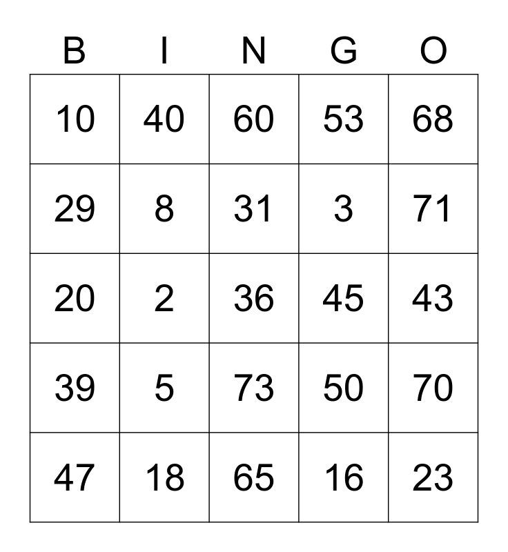 This bingo card has a free space and 24 words: 5, 18, 31, 47, 68, 10, 29, 40, 45, 73, 3, 20, 50, 70, 8, 16, 43, 60, 71, 2, 23, 39, 53 and 65.