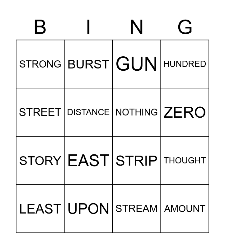 This bingo card has 16 words: UPON, THOUGHT, GUN, STRONG, STORY, BURST, STRIP, STREAM, STREET, DISTANCE, LEAST, HUNDRED, EAST, ZERO, NOTHING and AMOUNT.