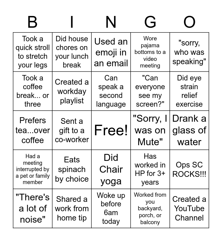 This bingo card has a free space and 24 words: Eats spinach by choice, Shared a work from home tip, Can speak a second language, "There's a lot of noise", "sorry, who was speaking", Took a quick stroll to stretch your legs, Took a coffee break... or three, Did house chores on your lunch break, "Sorry, I was on Mute", Did Chair yoga, "Can everyone see my screen?", Prefers tea...over coffee, Has worked in HP for 3+ years, Ops SC ROCKS!!!, Created a workday playlist, Worked from you backyard, porch, or balcony, Drank a glass of water, Used an emoji in an email, Did eye strain relief exercise, Sent a gift to a co-worker, Created a YouTube Channel, Had a meeting interrupted by a pet or family member, Wore pajama bottoms to a video meeting and Woke up before 6am today.