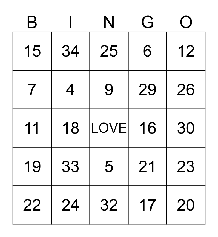 This bingo card has a free space and 35 words: 1, 2, 3, 4, 5, 6, 7, 8, 9, 10, 11, 12, 13, 14, 15, 16, 17, 18, 19, 20, 21, 22, 23, 24, 25, 26, 27, 28, 29, 30, 31, 32, 33, 34 and 35.