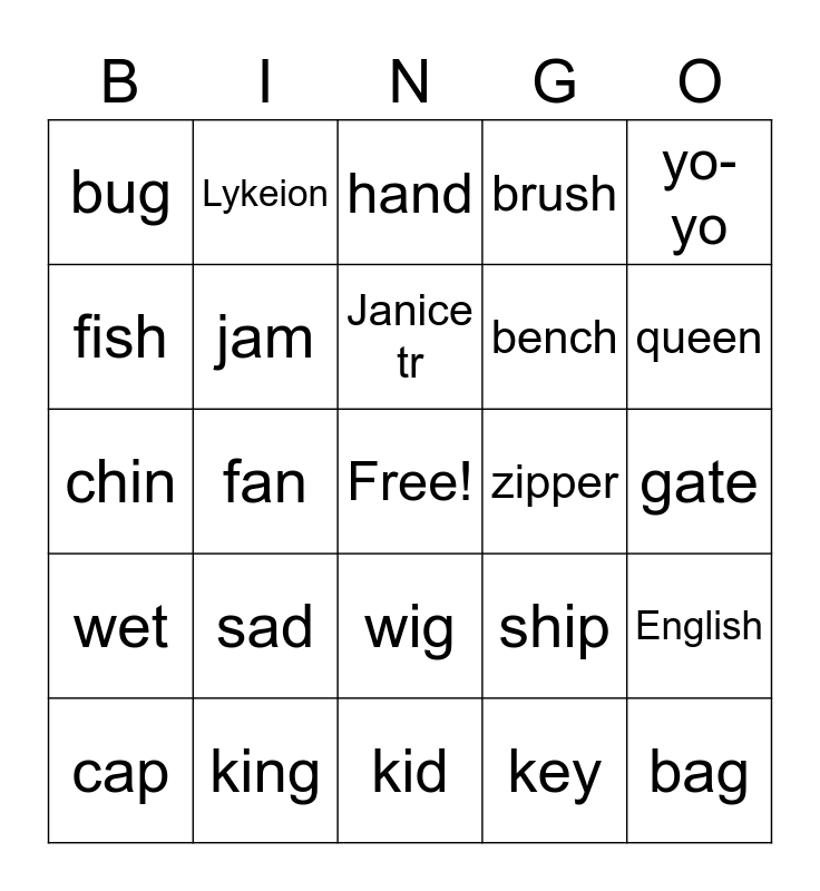 This bingo card has a free space and 29 words: cap, mop, fan, hen, bug, hand, jam, sad, zipper, king, gate, bag, kid, key, queen, quiet, wig, wet, yo-yo, chin, ship, lunch, bench, fish, brush, Lykeion, English, Janice tr and Alex tr.