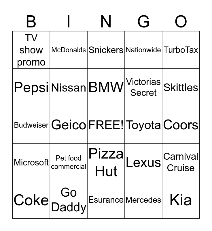 This bingo card has a free space and 24 words: Pet food commercial, Go Daddy, BMW, Coke, TurboTax, TV show promo, Pepsi, McDonalds, Toyota, Pizza Hut, Victorias Secret, Budweiser, Lexus, Carnival Cruise, Nissan, Mercedes, Coors, Snickers, Skittles, Geico, Kia, Microsoft, Nationwide and Esurance.