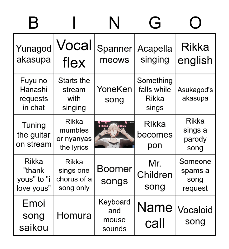 This bingo card has a free space and 24 words: Rikka sings one chorus of a song only, Homura, YoneKen song, Emoi song saikou, Rikka english, Yunagod akasupa, Fuyu no Hanashi requests in chat, Vocal flex, Rikka becomes pon, Boomer songs, Something falls while Rikka sings, Tuning the guitar on stream, Mr. Children song, Someone spams a song request, Starts the stream with singing, Name call, Rikka sings a parody song, Spanner meows, Asukagod's akasupa, Rikka mumbles or nyanyas the lyrics, Vocaloid song, Rikka "thank yous" to "i love yous", Acapella singing and Keyboard and mouse sounds.
