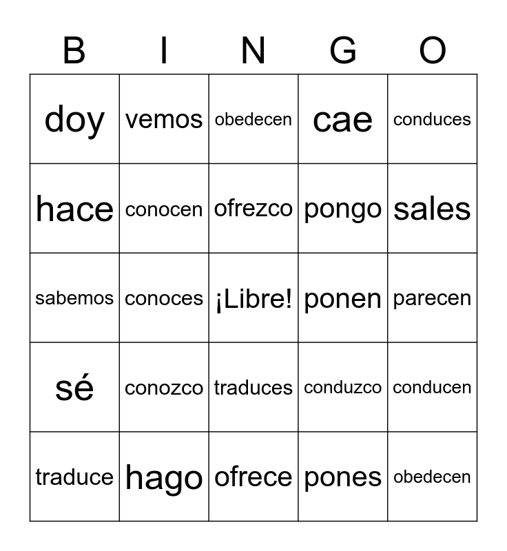 This bingo card has a free space and 34 words: caigo, pones, sale, hacemos, sé, conocen, conduces, traduce, vemos, dan, ofrezco, obedecen, parece, caemos, ponen, sales, hago, sabemos, conozco, conduzco, traduces, ve, doy, parecen, ofrece, obedecen, cae, salgo, pongo, hace, saben, conoces, conducen and ofrecemos.