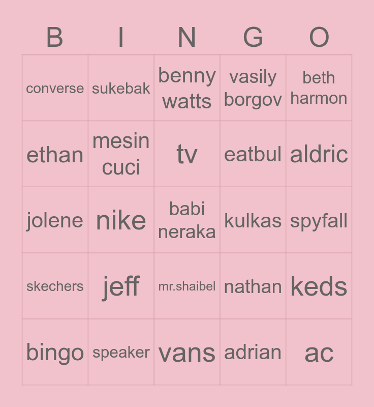 This bingo card has 25 words: jeff, vans, tv, bingo, beth harmon, converse, ethan, sukebak, kulkas, mr.shaibel, eatbul, jolene, nathan, keds, mesin cuci, ac, spyfall, benny watts, aldric, nike, babi neraka, speaker, skechers, vasily borgov and adrian.