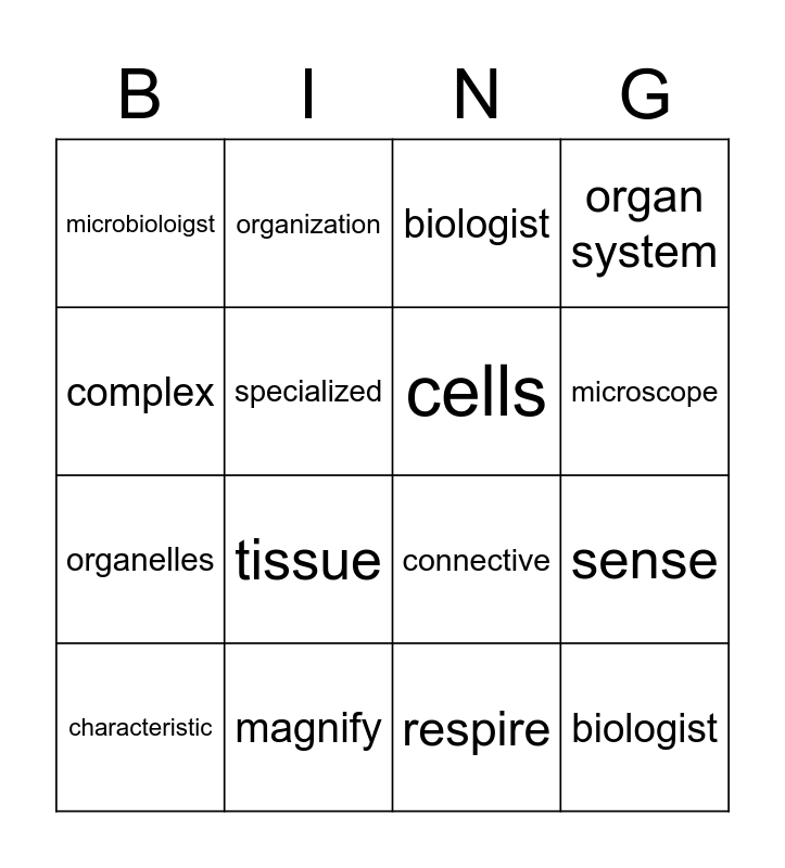 This bingo card has 16 words: magnify, sense, biologist, microbioloigst, organelles, organization, connective, respire, complex, specialized, characteristic, organ system, tissue, microscope, cells and biologist.