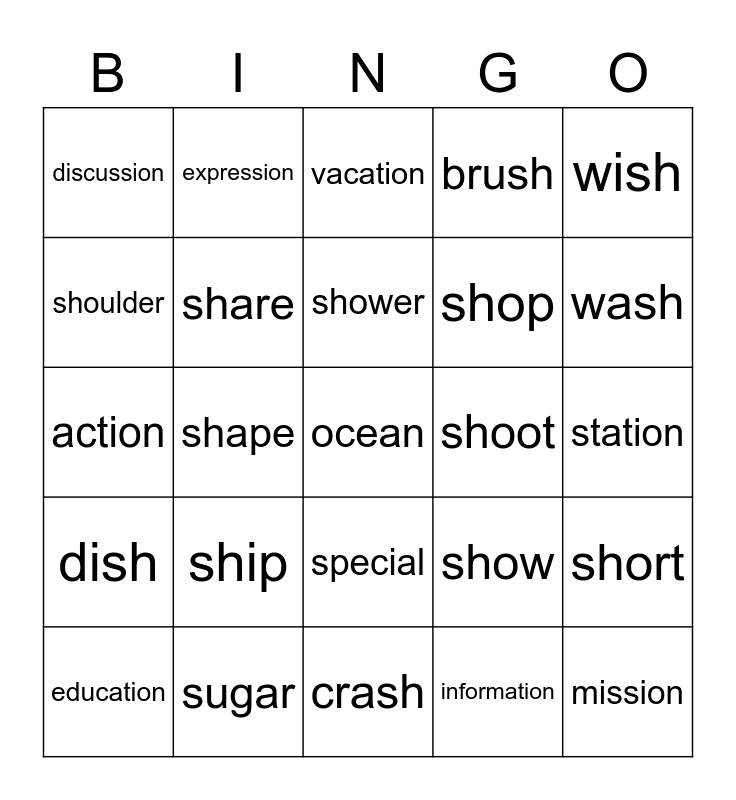 This bingo card has 25 words: ship, crash, shower, education, wish, discussion, shoulder, expression, shoot, special, shop, action, show, short, share, mission, station, vacation, wash, shape, ocean, sugar, dish, brush and information.
