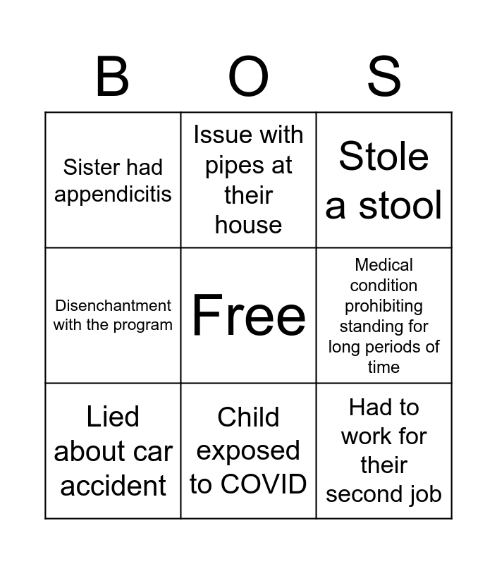 This bingo card has a free space and 17 words: Lost and/or broken phone, Migraines, Stole a stool, Sister had appendicitis, Self-diagnosed non-COVID illness, Disenchantment with the program, Asthma attack, Lied about car accident, Child exposed to COVID, Medical condition prohibiting standing for long periods of time, Failed background check, Power company gave 9am-5pm window to fix outage, Had to work for their second job, Issue with pipes at their house, Dog seizures, Dog had to be put down and Completely MIA and never resurfaced.