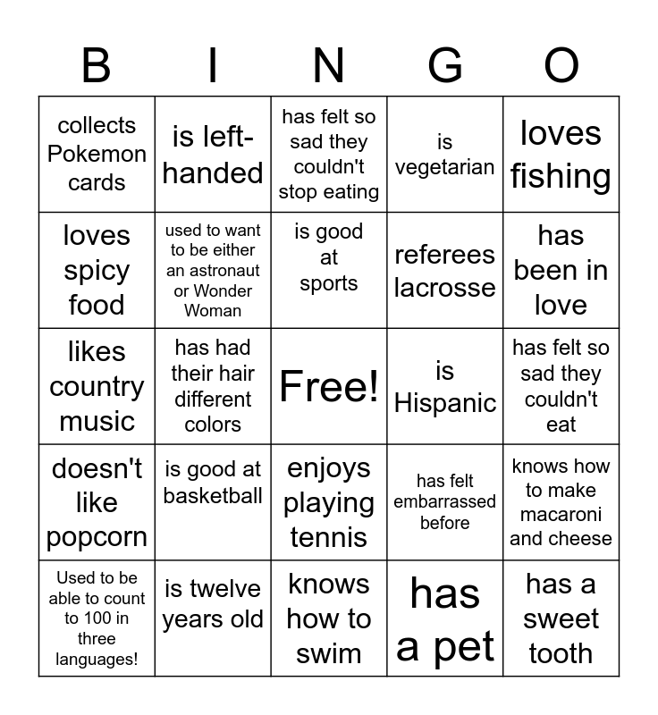 This bingo card has a free space and 24 words: is good at basketball, is twelve years old, is good at sports, Used to be able to count to 100 in three languages!, loves fishing, collects Pokemon cards, loves spicy food, is left-handed, is Hispanic, enjoys playing tennis, referees lacrosse, likes country music, has felt embarrassed before, knows how to make macaroni and cheese, used to want to be either an astronaut or Wonder Woman, has a pet, has felt so sad they couldn't eat, has felt so sad they couldn't stop eating, has been in love, has had their hair different colors, has a sweet tooth, doesn't like popcorn, is vegetarian and knows how to swim.