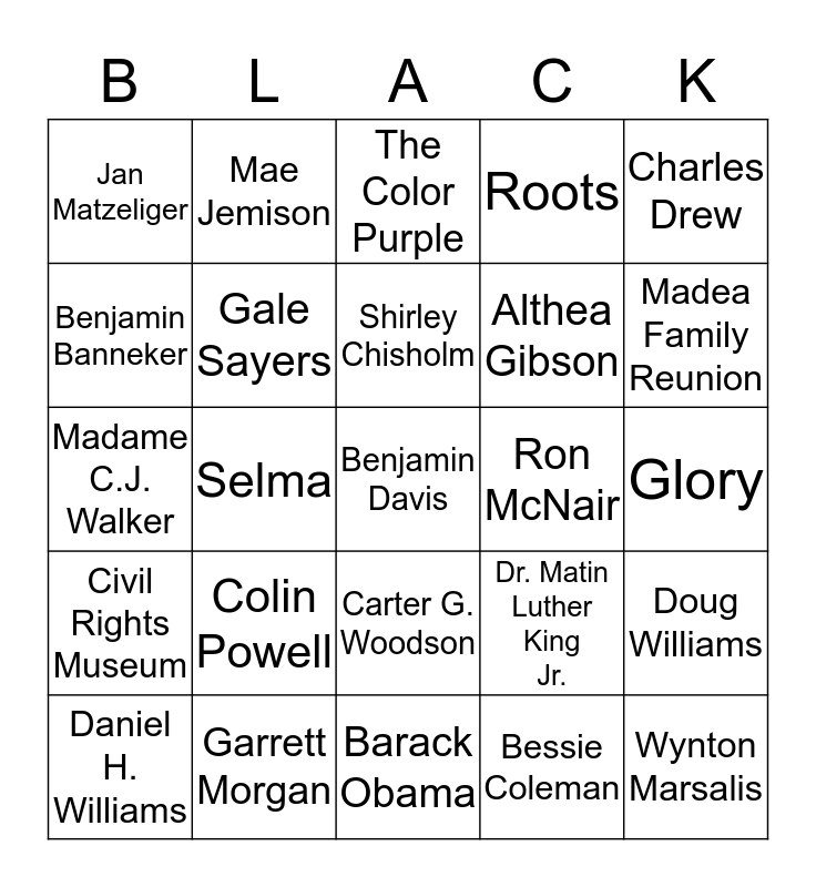 This bingo card has 25 words: Colin Powell, Barack Obama, Shirley Chisholm, Daniel H. Williams, Charles Drew, Jan Matzeliger, Benjamin Banneker, Mae Jemison, Ron McNair, Carter G. Woodson, Althea Gibson, Madame C.J. Walker, Dr. Matin Luther King Jr., Doug Williams, Gale Sayers, Wynton Marsalis, Glory, The Color Purple, Madea Family Reunion, Selma, Benjamin Davis, Garrett Morgan, Civil Rights Museum, Roots and Bessie Coleman.