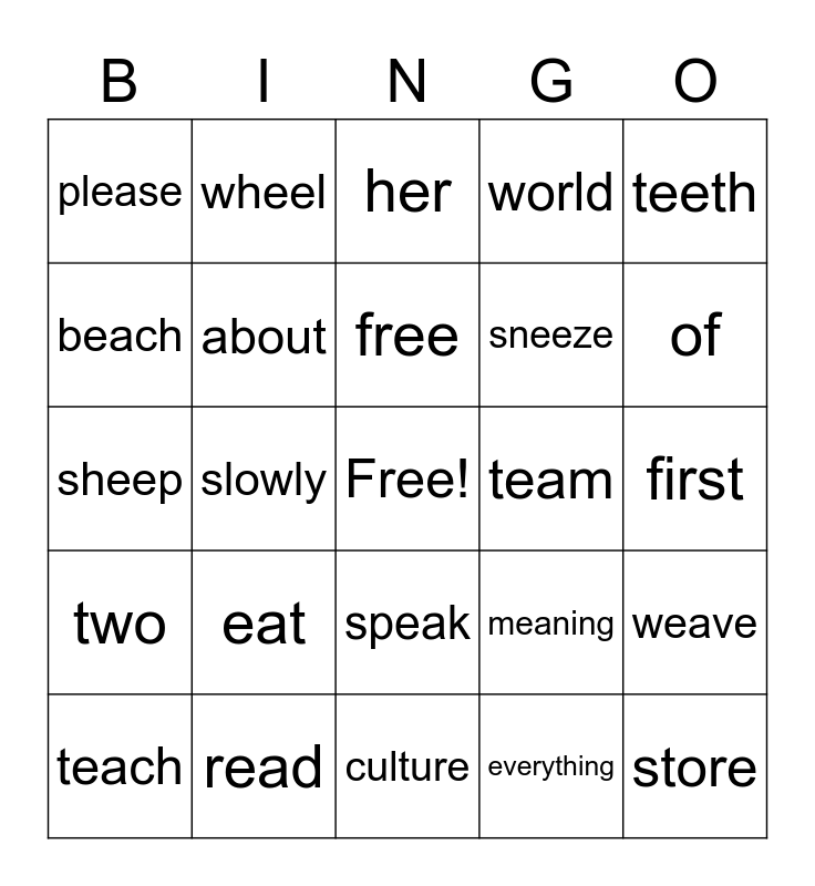 This bingo card has a free space and 24 words: eat, read, free, teach, teeth, please, beach, wheel, team, speak, sneeze, sheep, meaning, weave, about, everything, first, her, of, slowly, store, two, world and culture.