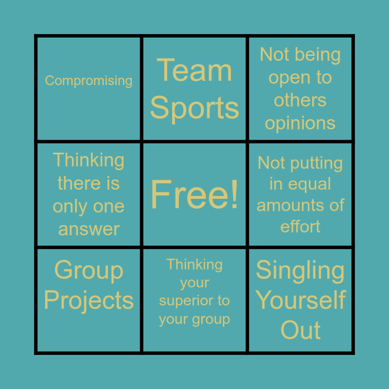 This bingo card has a free space and 8 words: Not putting in equal amounts of effort, Not being open to others opinions, Team Sports, Group Projects, Compromising, Singling Yourself Out, Thinking there is only one answer and Thinking your superior to your group.