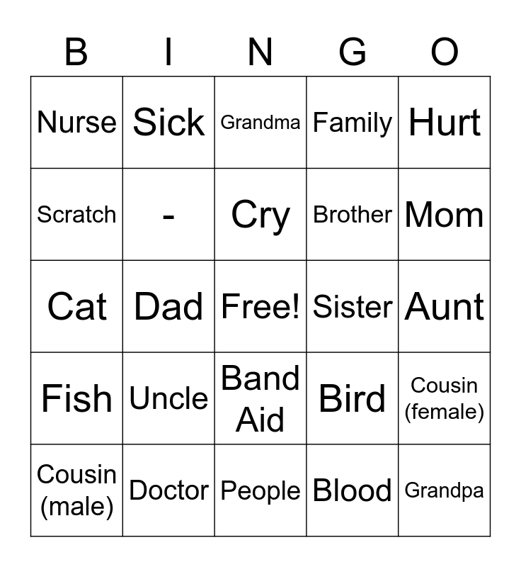 This bingo card has a free space and 26 words: Band Aid, Blood, Cry, Doctor, Hurt, Nurse, Scratch, Sick, Aunt, Bird, Brother, Cat, Cousin (female), Cousin (male), Dad, Dog, Family, Fish, Grandma, Grandpa, Mom, People, Sister, Uncle, - and -.