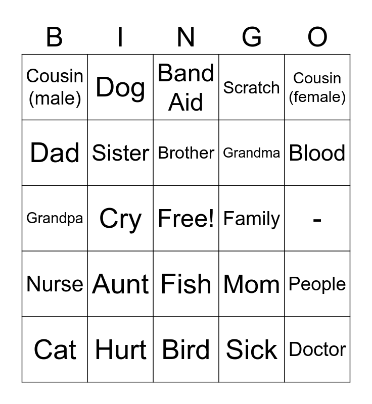 This bingo card has a free space and 25 words: Aunt, Bird, Brother, Cat, Cousin (female), Cousin (male), Dad, Dog, Family, Fish, Grandma, Grandpa, Mom, People, Sister, Uncle, -, Band Aid, Blood, Cry, Doctor, Hurt, Nurse, Scratch and Sick.