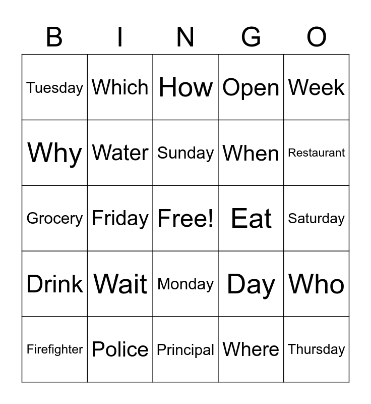 This bingo card has a free space and 28 words: Who, What, When, Where, Why, How, Which, Drink, Eat, Firefighter, Grocery, Open, Police, Principal, Restaurant, Store, Wait, Water, Sunday, Monday, Tuesday, Wednesday, Thursday, Friday, Saturday, Day, Week and Weekend.