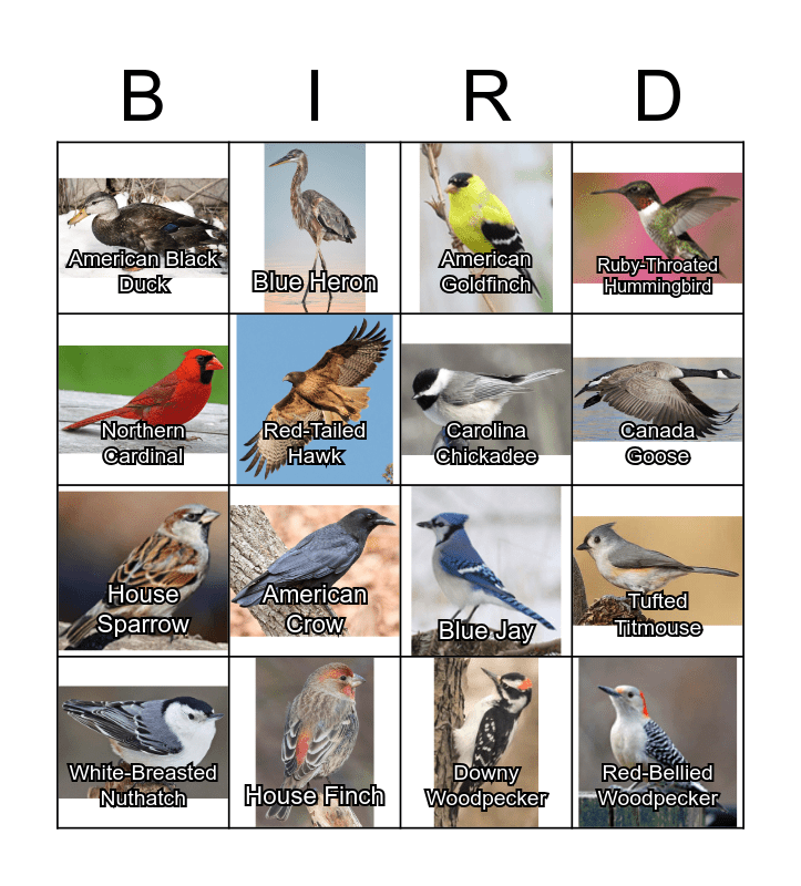 This bingo card has 22 images and 22 words: House Finch, Common Grackle, Blue Heron, Rock Pigeon, Red-Tailed Hawk, Carolina Chickadee, American Black Duck, American Goldfinch, Blue Jay, Red-Bellied Woodpecker, House Sparrow, Ruby-Throated Hummingbird, American Robin, Morning Dove, Downy Woodpecker, Dark-Eyed Junco, Tufted Titmouse, White-Breasted Nuthatch, American Crow, Northern Cardinal, Canada Goose and Mallard Duck.