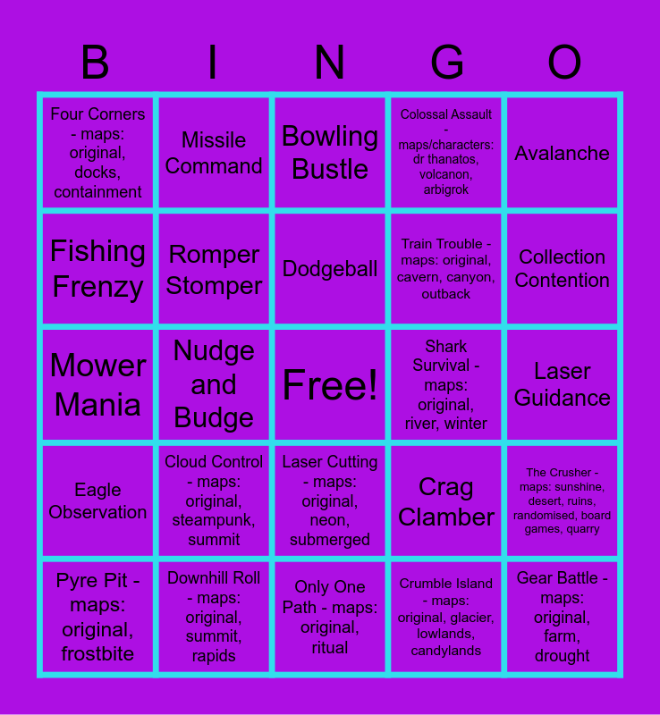 This bingo card has a free space and 105 words: Above water, Accurate archery, Avalanche, Aztec Adventure, Balcony Bolt, Balloon Platoon, Battleship Skirmish, Big Bomb Room, Black Hole Scramble, Blast Mining, Block Hunt, Blow Dryer Battle - maps: original, island, Blox City Brawl, Bombastic Bash, Bombs Away, Bomb Ball - maps: original, valley, catalyst, Bowling Bustle, Brickbattle, Bullet Bound, Bullet Evasion, Cake Delivery - maps: original (replaced by town), temple, town, Cannon Cooldown, Castle Clash - maps: original, territory, Castle Climb, Clear Side, Cloud Control - maps: original, steampunk, summit, Collection Contention, Colossal Assault - maps/characters: dr thanatos, volcanon, arbigrok, Compactor Crash, Conveyor Conundrum, Crag Clamber, Crumble Island - maps: original, glacier, lowlands, candylands, Crystal Clear - maps: original, settlement,western, Cube Factory - maps: depot (the current original map), Deforestation Dash - maps: original, winter, Desert Dehydration - maps: original, pit, Destroy the Statue - maps:, skylands, lake, Dizzying Decisions - maps: original, crater, Dodgeball, Downhill Roll - maps: original, summit, rapids, Drawing the Line, Eagle Observation, Expedition Sprint - maps: original, canyon, Fishing Frenzy, Flintlock Fight - maps: original, western, Four Corners - maps: original, docks, containment, Freeze Affray - maps: original, lodge, Gear Battle - maps: original, farm, drought, Gladiator Grounds - maps: original, frosted, marsh, historium, Going Underground - maps: original, grove, Hard-Pressed, Haunted Hallways - maps: original, lakeside, Hedge Way Out - maps: original, castle, High Pressure, High Rolling - maps: original, space, Hurdle Hurry, Just Jump, King of the Hill - maps: island, shrine, Lane Jumping, Laser Cutting - maps: original, neon, submerged, Laser Guidance, Laser Tag, Lava Forecast - maps: original, crater, Lights On, Manic Mining, Marble Madness - maps: original, valley, Mechanical Mayhem - maps: original, clock, core, Missile Command, Mower Mania, Nudge and Budge, Only One Path - maps: original, ritual, Orbit Snatcher, Outbreak - maps: original, oil platform, Paint to Perfection - maps: original, cave, Penguin Pushover, Pipeworks - maps: original, sewers, original duo, sewers duo, Platform Peril, Protect the Statue - maps: original, atlantis, Pyre Pit - maps: original, frostbite, Revolution Cube, Ring Diver, Rocket Rumble, Rolling Race - maps: original, canyon, Romper Stomper, Round Race, Shark Survival - maps: original, river, winter, Shock Absorbers, Skewer Shuffle, Slippery Sledding - maps: original, frozen passage, Solo Swordsman - maps: original, outpost, resort, Spiky Spinner, Spiral Ascent, Teamwork Trial - maps: grid, gulch, Teetering Turmoil, The Crusher - maps: sunshine, desert, ruins, randomised, board games, quarry, The Sweeper - maps: original, woodland, cake, basin, Tile Takeover - maps: original, gardens, Toxic Reactions - maps: original, plant, western, Train Trouble - maps: original, cavern, canyon, outback, Treacherous Tiles, Trial Traversing - maps: original, lavascape, extraction, simulation, electrodrome, Turntable Scurry, Uncertain Ground - maps: original, temple, Undead Aboard and Whack-a-Block - maps: original, cave.