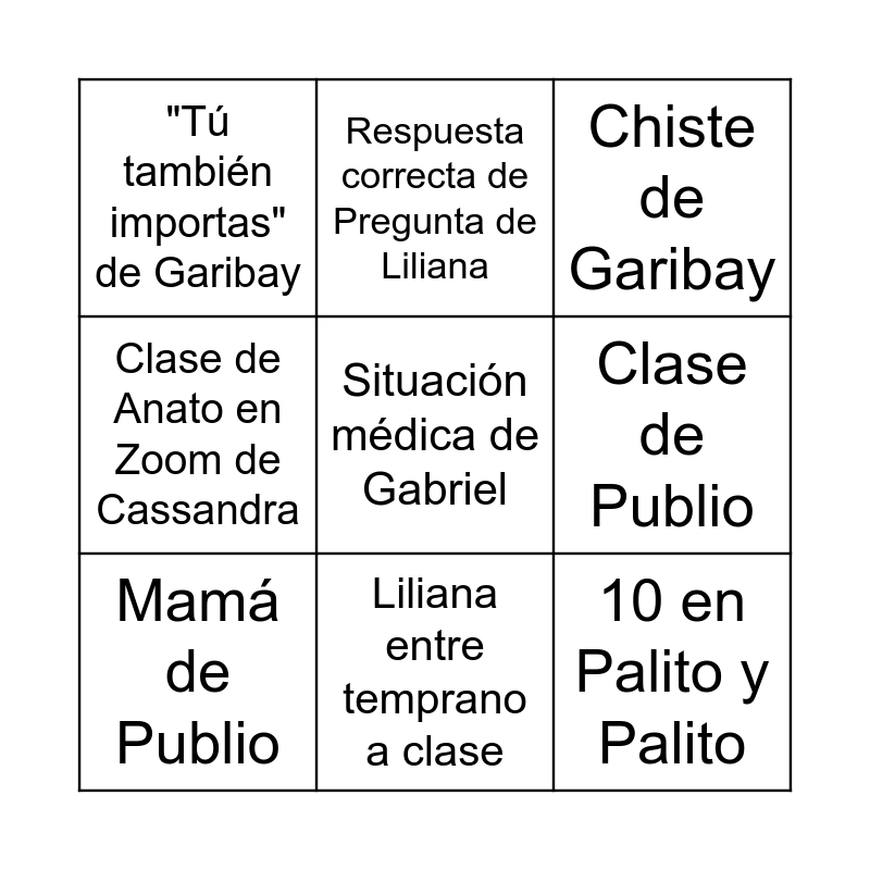 This bingo card has 19 words: Sermón de Garibay, Sermón de Liliana, Chiste de Garibay, Chiste de Gabriel, Reflujo de Liliana, Situación médica de Gabriel, Anécdota de Gabriel, "Tú también importas" de Garibay, Respuesta correcta de Pregunta de Liliana, 10 en Palito y Palito, 8 o más en Palito y Palito, Clase de Publio, Mamá de Publio, Clase de Christa, "Qué tenga un excelente día" de Cassandra, Garibay canta, Clase de Anato en Zoom de Cassandra, Liliana entre temprano a clase and "2 puntos menos" de Garibay.