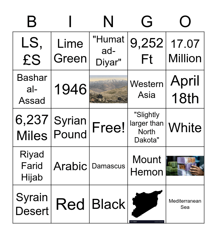 This bingo card has 3 images, a free space and 21 words: Arabic, Red, Syrain Desert, 17.07 Million, LS, £S, Bashar al-Assad, Lime Green, "Slightly larger than North Dakota", Damascus, Western Asia, 6,237 Miles, Mount Hemon, 1946, White, "Humat ad-Diyar", April 18th, Syrian Pound, Mediterranean Sea, Riyad Farid Hijab, 9,252 Ft and Black.