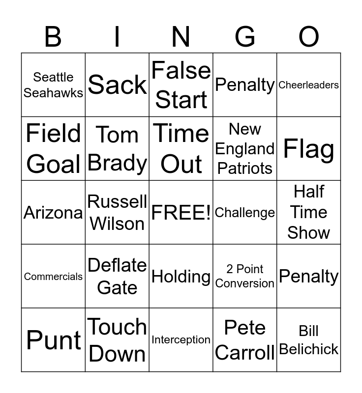 This bingo card has a free space and 24 words: Deflate Gate, Touch Down, Time Out, Punt, Cheerleaders, Seattle Seahawks, Field Goal, Sack, Challenge, Holding, New England Patriots, Arizona, 2 Point Conversion, Penalty, Tom Brady, Pete Carroll, Half Time Show, False Start, Flag, Russell Wilson, Bill Belichick, Commercials, Penalty and Interception.
