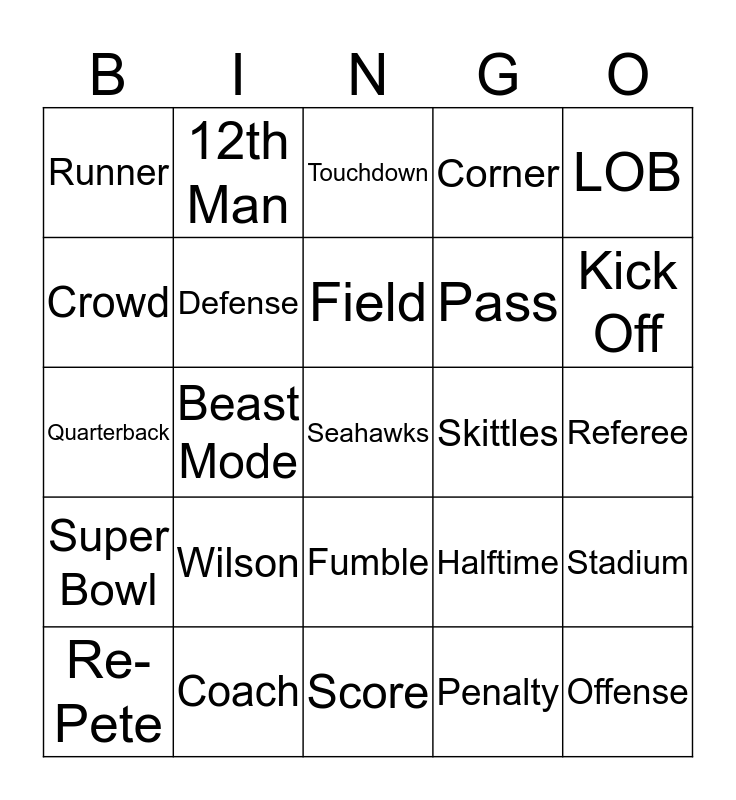 This bingo card has a free space and 24 words: Wilson, Coach, Field, Re-Pete, LOB, Runner, Crowd, 12th Man, Skittles, Fumble, Pass, Quarterback, Halftime, Stadium, Defense, Penalty, Referee, Touchdown, Kick Off, Beast Mode, Offense, Super Bowl, Corner and Score.
