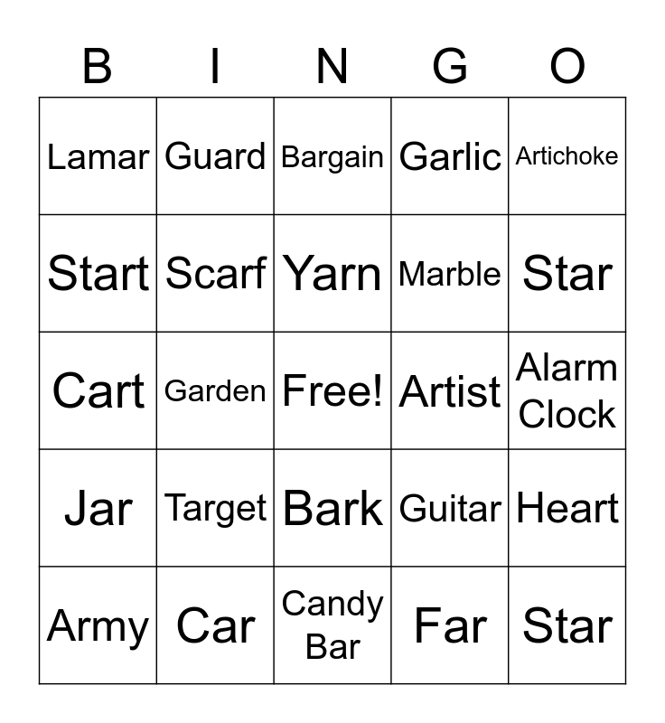This bingo card has a free space and 29 words: Army, Arm, Garden, Guard, Lamar, Bargain, Scarf, Target, Artist, Car, Alarm Clock, Star, Candy Bar, Far, Star, Armadillo, Bark, Jar, Artichoke, Cart, Guitar, Farm, Marble, Start, Garlic, Guard, Heart, Yarn and Dark.