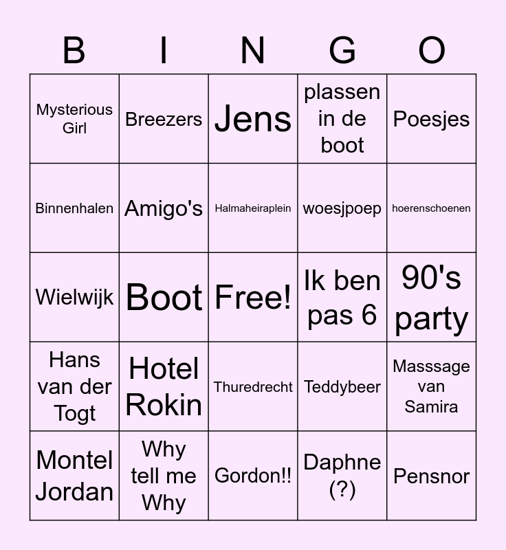 This bingo card has a free space and 75 words: Jill, Jace, Jens, Plakkie, Spicaring, Zwemmen, Poppetjes!, Peter Andre, Smurfensnot, meneer Arends, De potjes worden nat, Koningstraat, Halmaheiraplein, Binnenhalen, Sin, Boot, Gaypride, Pensnor, Punisap, Poesjes, Sterrenburg, Wielwijk, Amigo's, Breezers, plassen in de boot, Muisje bij Chinees, pussyjuice, We are your friend, tong knippen, goudvis, Leila, Fab, Alicia, Teddybeer, hoerenschoenen, woesjpoep, Kiss, Gigi, 90's party, Daphne (?), Wachten op stoepje, Schoen likken, Broek plassen, Binnenhalen, Five, LL Cool J, Montel Jordan, Mysterious Girl, Dear Lie jaja, Warmoesstraat, Zebrapath, Thuredrecht, Abeltje, Tom ik heb je mes, Mees, Zakmes, Cynthia, Hoek van Holland, Sluiskil verhuizen, Gekke Luis, Turnen, Hotel Rokin, Amsterdam, Kruidvat, Sisqo, Dru Hill, Ik ben pas 6, Richard & Simon, Bartje Abu, Bahar, Masssage van Samira, Hans van der Togt, Why tell me Why, Troubadour, Gordon!! and Hey Peter.