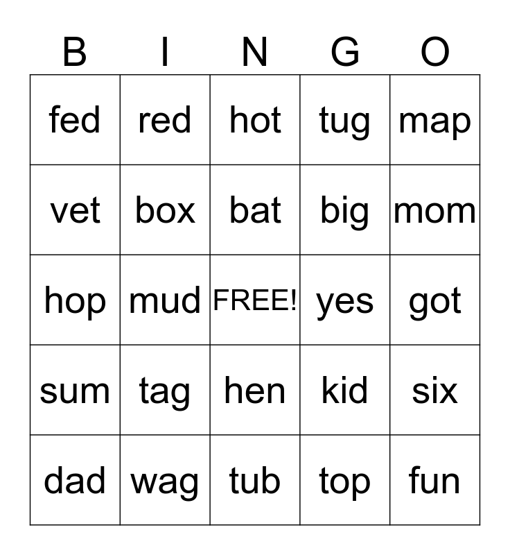 This bingo card has a free space and 24 words: tag, wag, bat, dad, map, fed, vet, red, yes, hen, big, hop, kid, six, box, top, got, hot, mom, mud, fun, sum, tug and tub.