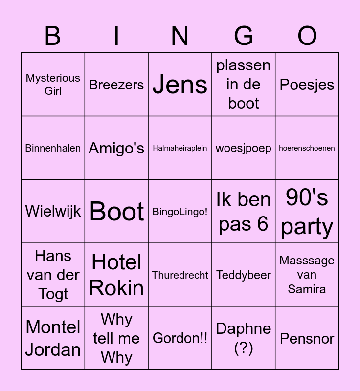 This bingo card has a free space and 75 words: Jill, Jace, Jens, Plakkie, Spicaring, Zwemmen, Poppetjes!, Peter Andre, Smurfensnot, meneer Arends, De potjes worden nat, Koningstraat, Halmaheiraplein, Binnenhalen, Sin, Boot, Gaypride, Pensnor, Punisap, Poesjes, Sterrenburg, Wielwijk, Amigo's, Breezers, plassen in de boot, Muisje bij Chinees, pussyjuice, We are your friend, tong knippen, goudvis, Leila, Fab, Alicia, Teddybeer, hoerenschoenen, woesjpoep, Kiss, Gigi, 90's party, Daphne (?), Wachten op stoepje, Schoen likken, Broek plassen, Binnenhalen, Five, LL Cool J, Montel Jordan, Mysterious Girl, Dear Lie jaja, Warmoesstraat, Zebrapath, Thuredrecht, Abeltje, Tom ik heb je mes, Mees, Zakmes, Cynthia, Hoek van Holland, Sluiskil verhuizen, Gekke Luis, Turnen, Hotel Rokin, Amsterdam, Kruidvat, Sisqo, Dru Hill, Ik ben pas 6, Richard & Simon, Bartje Abu, Bahar, Masssage van Samira, Hans van der Togt, Why tell me Why, Troubadour, Gordon!! and Hey Peter.