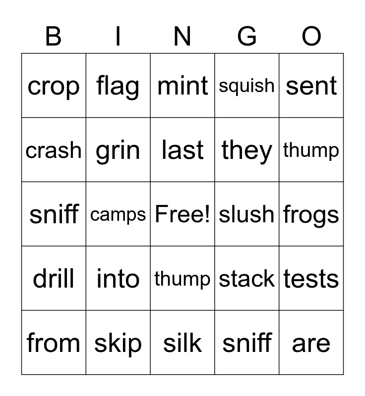 This bingo card has a free space and 36 words: what, why, when, they, are, from, into, bench, squish, cross, drill, camps, shrug, frogs, sniff, flag, silk, slush, thump, crop, skip, last, stack, swish, sent, grin, mint, stuck, sent, crash, bunch, thump, sniff, tests, drips and squish.