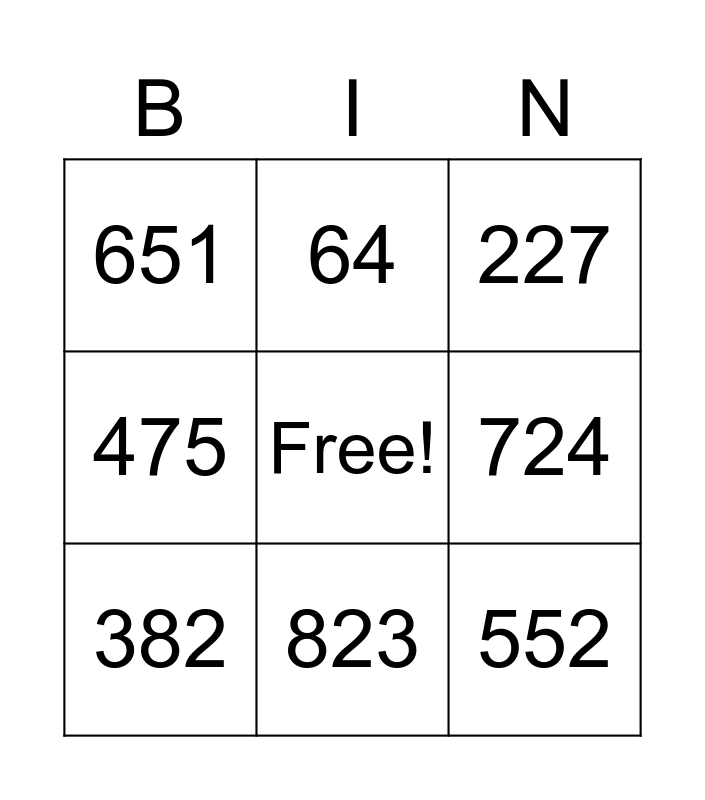 This bingo card has a free space and 9 words: 382, 227, 64, 475, 651, 724, 552, 821 and 823.